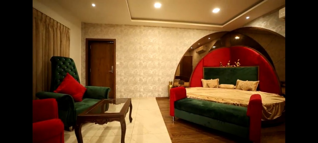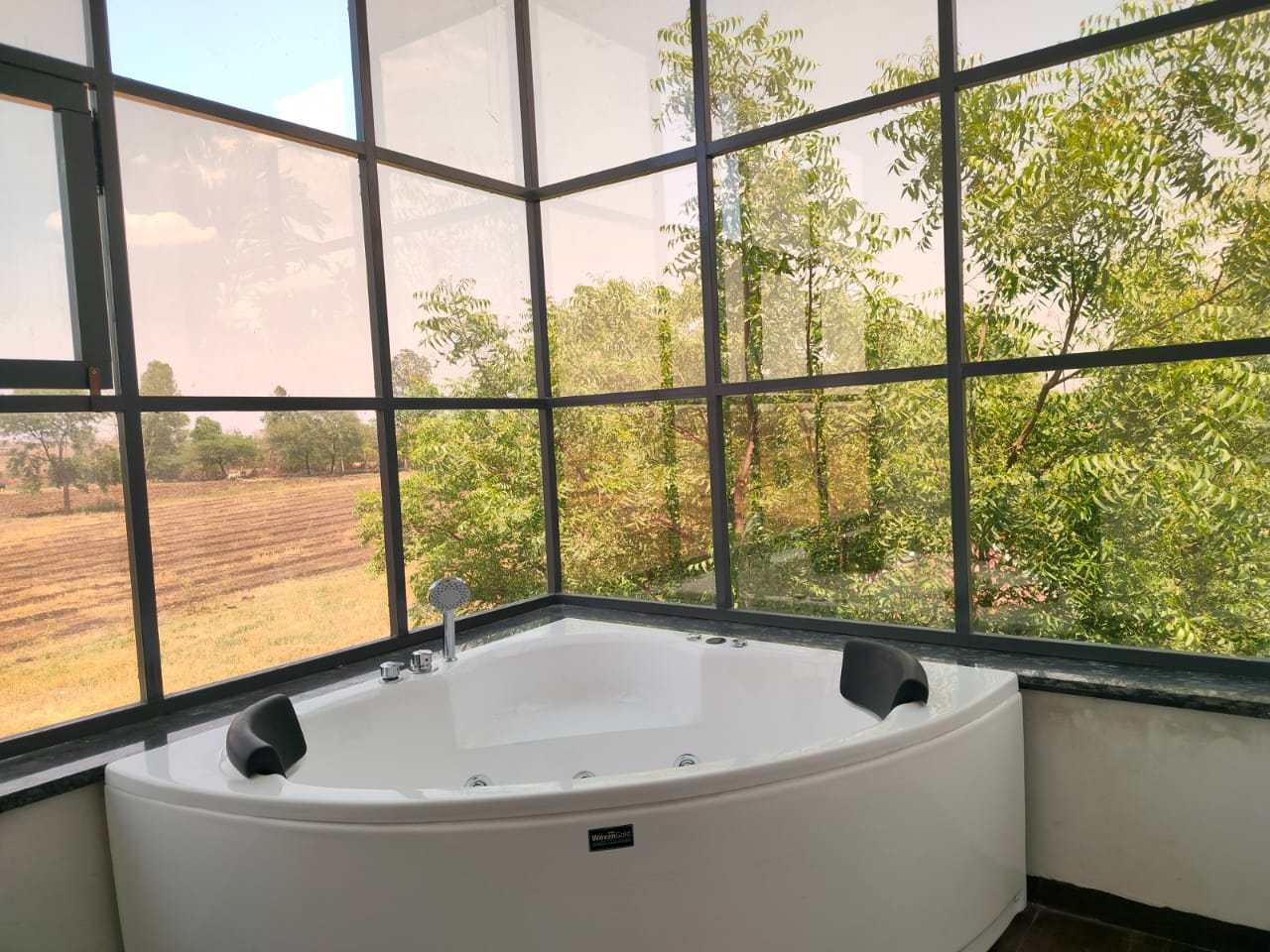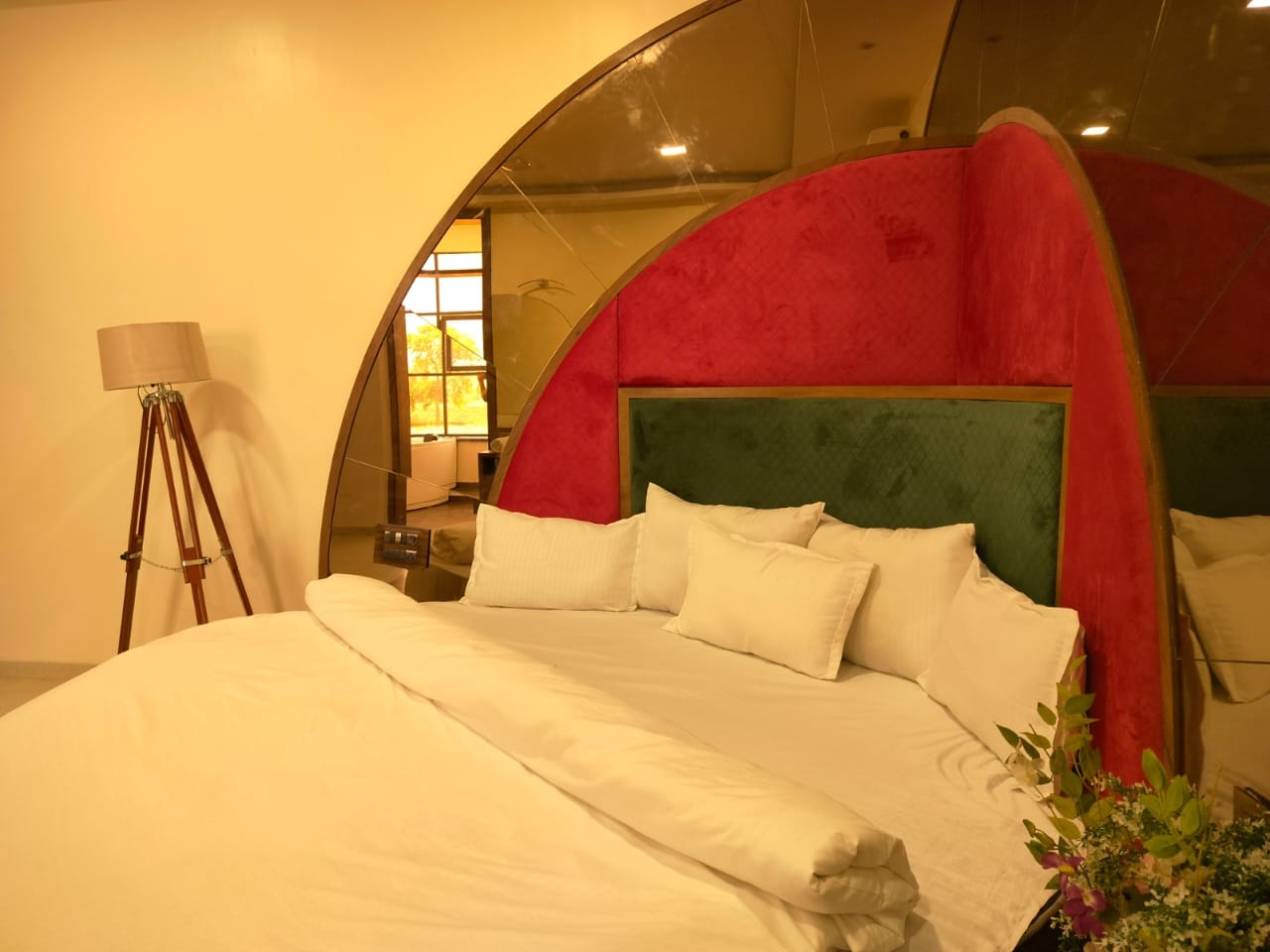 The Samardha Room combines rustic charm with modern comfort, set against the tranquil backdrop of Samardha Jungle. This cozy space features earthy decor, wooden furnishings, and large windows offering scenic forest views.